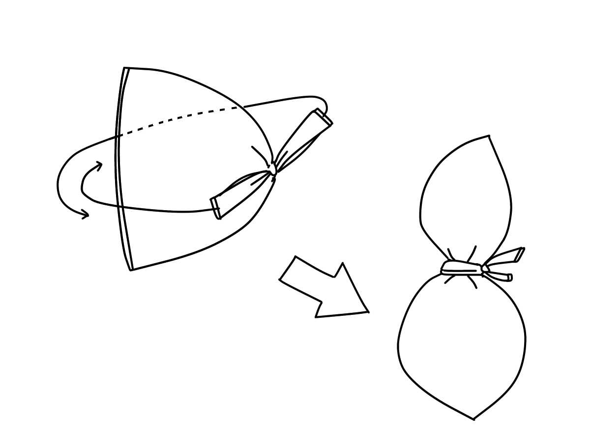 A持ち手部分をしばって、少しずつ空気をぬきながら袋の真ん中あたりに巻き付けて再びしばります。