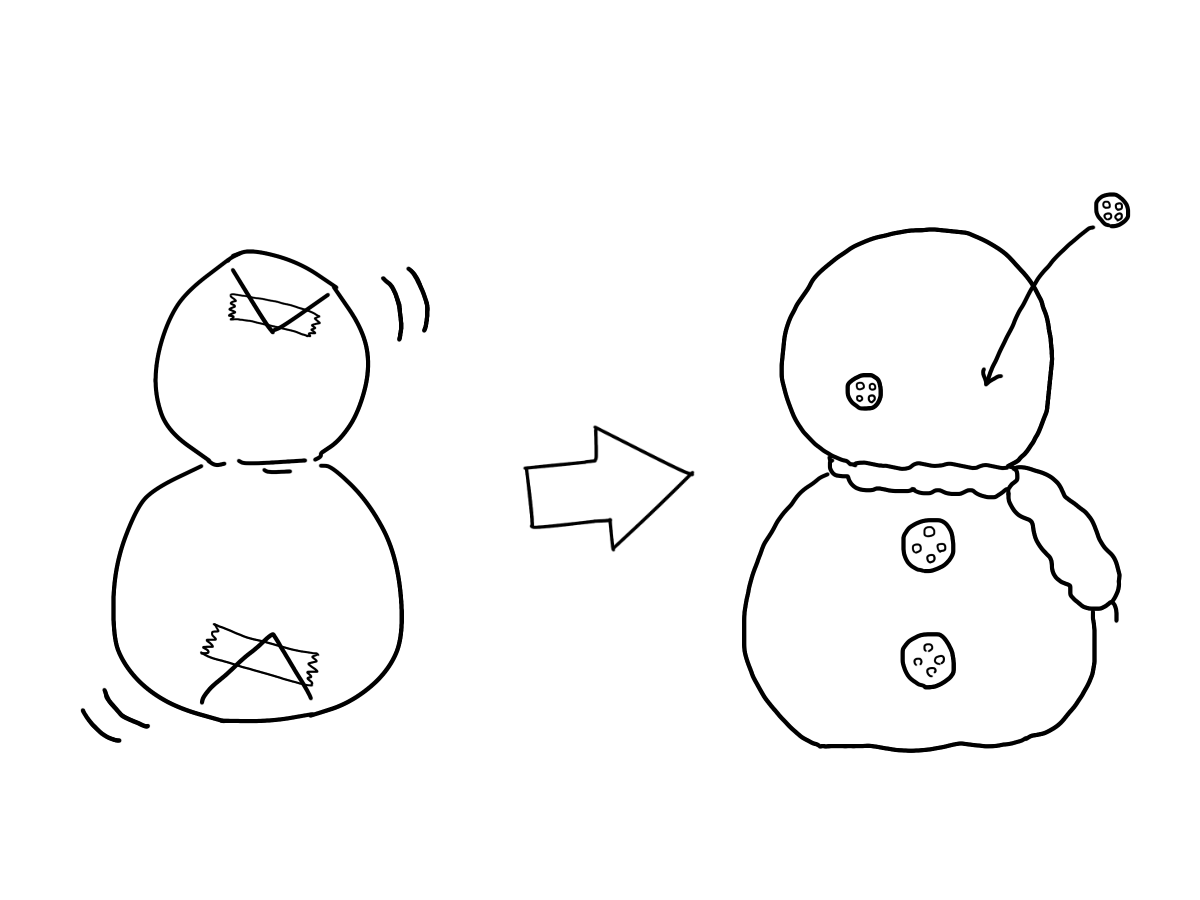 とがってしまう所は 寝かせてテープでとめましょう。目やボタンはカラーラベルなどを貼っても良いですね。