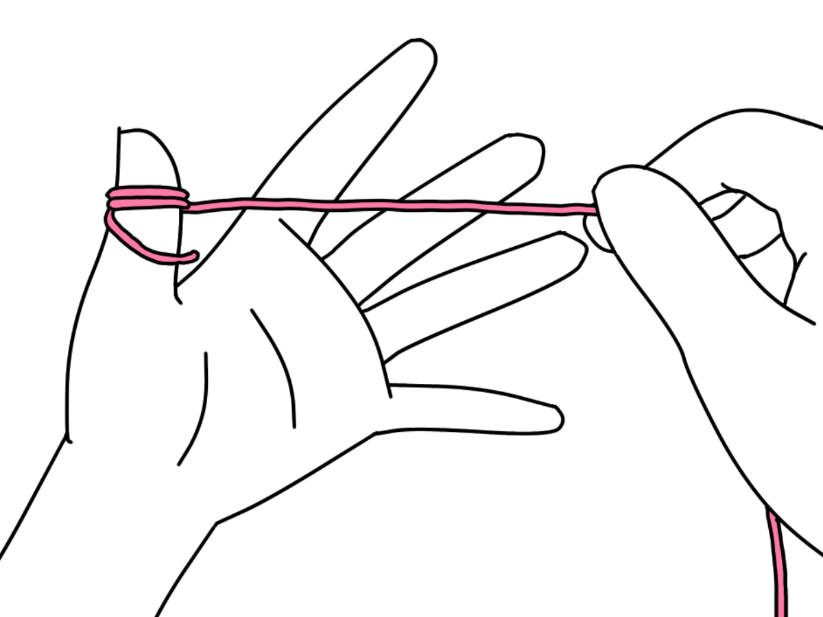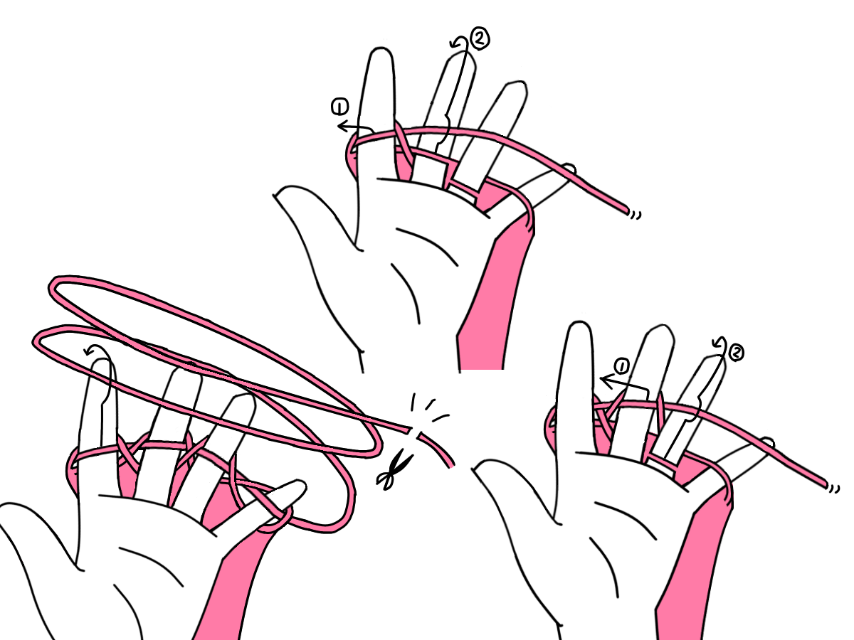 F最後は 指4本に2回巻いたくらいの長さを残して切ります。編んだ指から順に下の毛糸を引き抜いて、小指まで行ったら完成です。