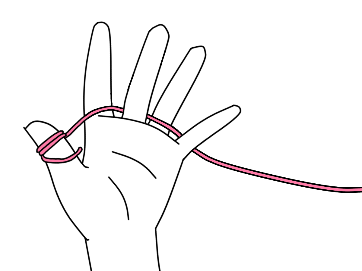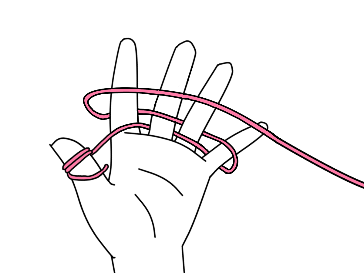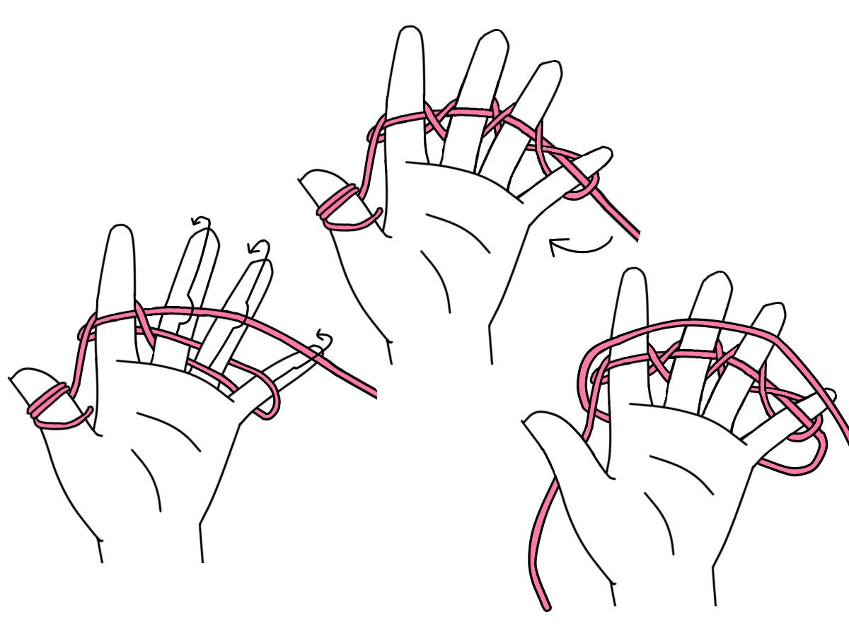 D残りの指も順に外して 指の向こう側を通してCに戻って繰り返します。親指の毛糸はほどきます。