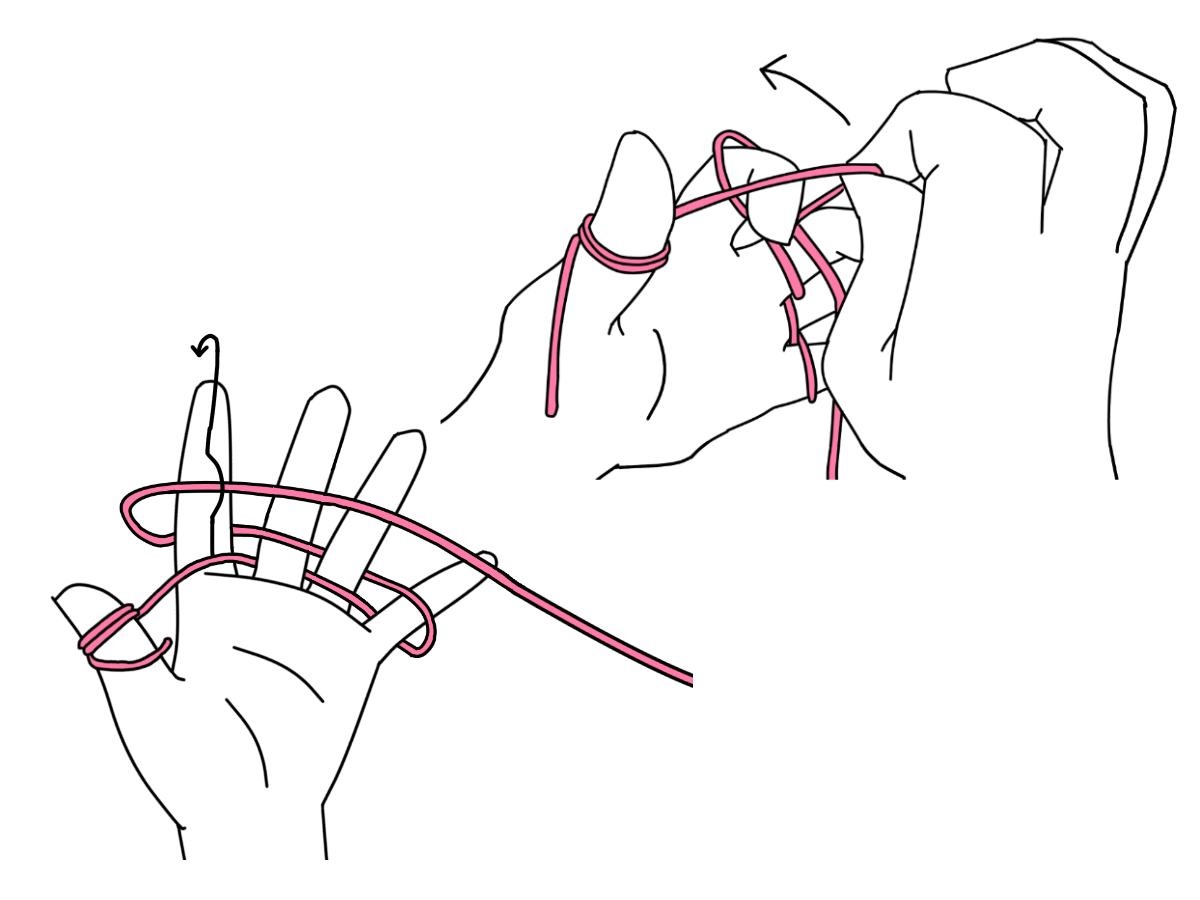 C人差し指から、前に回した毛糸を 飛び越えるように 下の毛糸を外します。