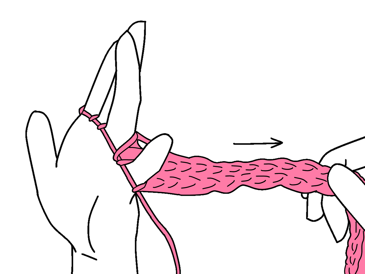 *Dの時に指の向こう側を通さず 小指から戻るように編むと帯状のマフラーになります。子どもの小さな手ほど網目がキレイに仕上がりますよ。