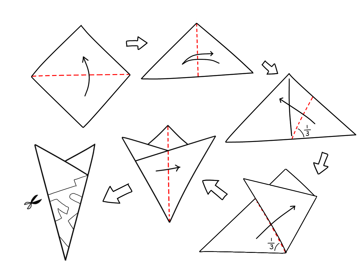 図のようにおりがみを12等分して、好きな形に切るだけ!